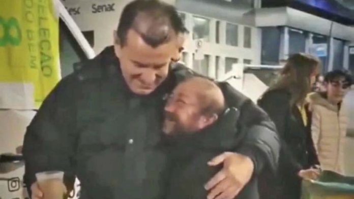 Dunga, que colocava chocolate quente nos copos, enquanto outra pessoa distribuía para os moradores de rua, parou a tarefa e deu um forte abraço no torcedor do seu clube de coração. Ele ainda pediu que o homem se alimentasse também com a refeição oferecida pela ação beneficente e, visivelmente, se emocionou com o carinho do morador de rua.Morador de rua emocionado ao reconhecer Dunga, que estava distribuindo alimentos para pessoas necessitadas.Sensacional! ❤️🎥 Reprodução pic.twitter.com/6o0gBuLeAj— Planeta do Futebol 🌎 (@futebol_info) July 24, 2023